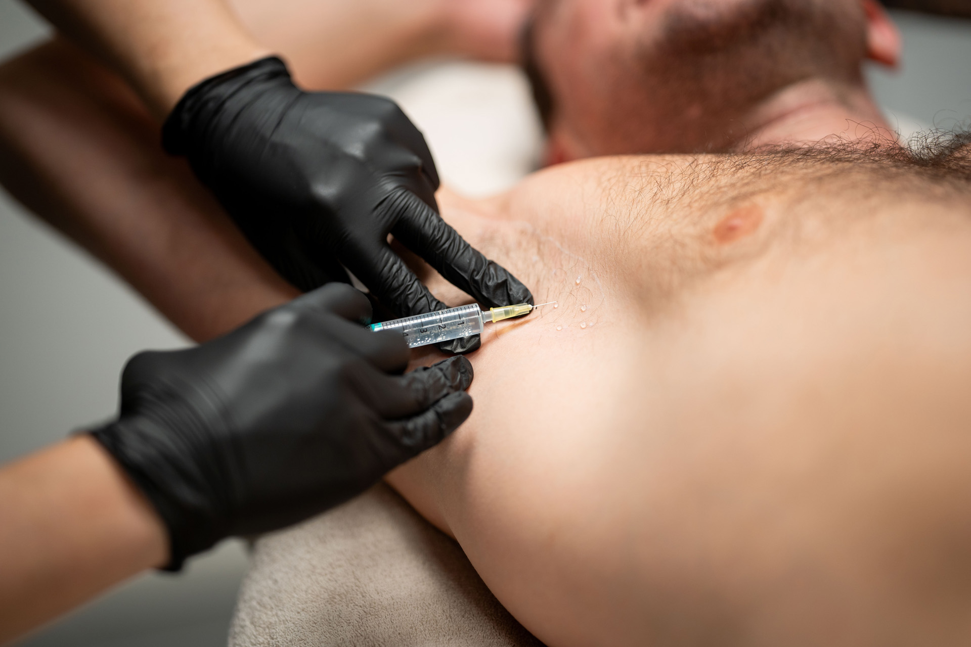 Vi behandlar överdriven svettning med injektion av Botox som injiceras i huden lokalt i området där svettningen förekommer och blockerar nervimpulsen till svettkörteln.