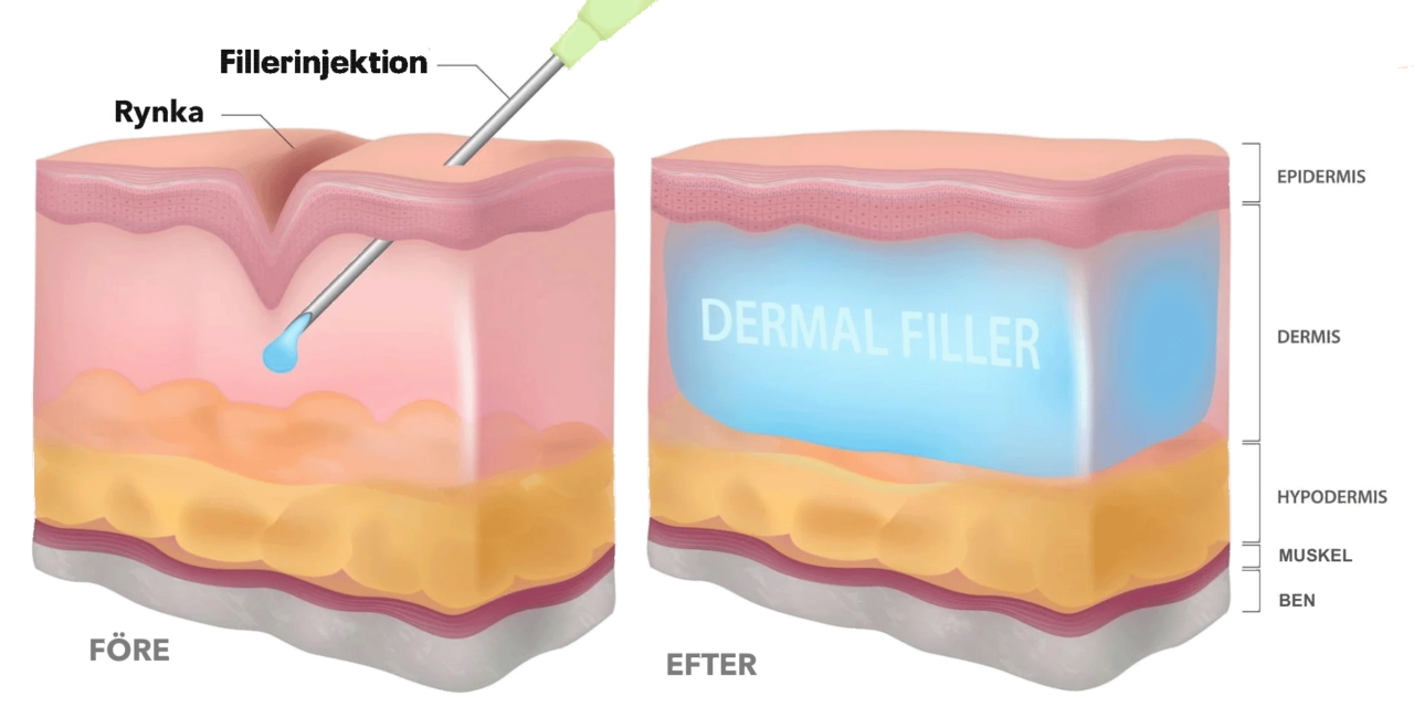 Fillers är uppbyggt av hyaluronsyra, ett ämne som redan finns naturligt i huden. Hyaluronsyra binder fukt och ger huden spänst. Det bryts naturligt ner av huden i takt med att vi åldras, vilket gör att vi får en mer fuktfattig och slapp hud när vi blir äldre.